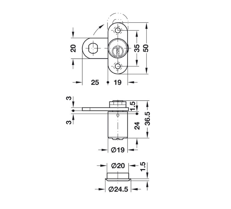 Supplied with 1 cam lock 2 keys 1 cylinder rosette 1 cam (pre-mounted) 2 fixing nuts (pre-mounted)