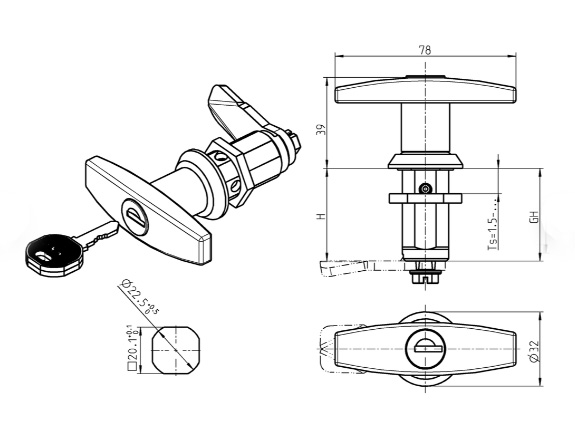 T-handle quarter turn, keyed EK 333, Zinc die chrome-plated; 1000-U118