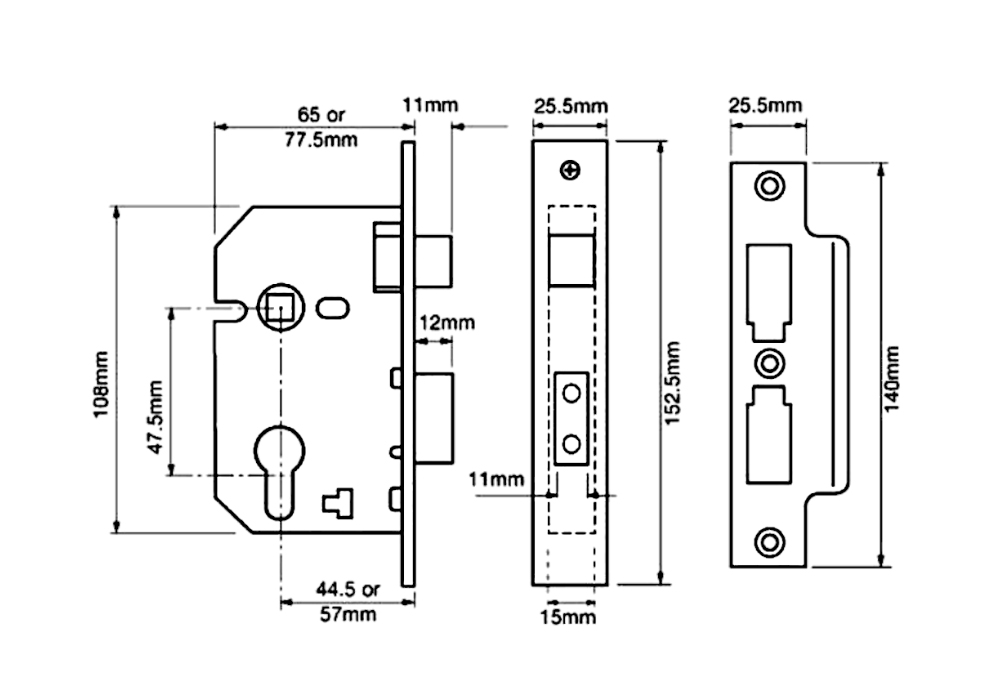 Euro Profile Mortice sash lock ( case only) Features 10 Year Guarantee Case only UK Manufactured Reversible latch bolt Latch bolt withdrawn by sprung lever handle from either side Pierced to accept bolt through furniture
