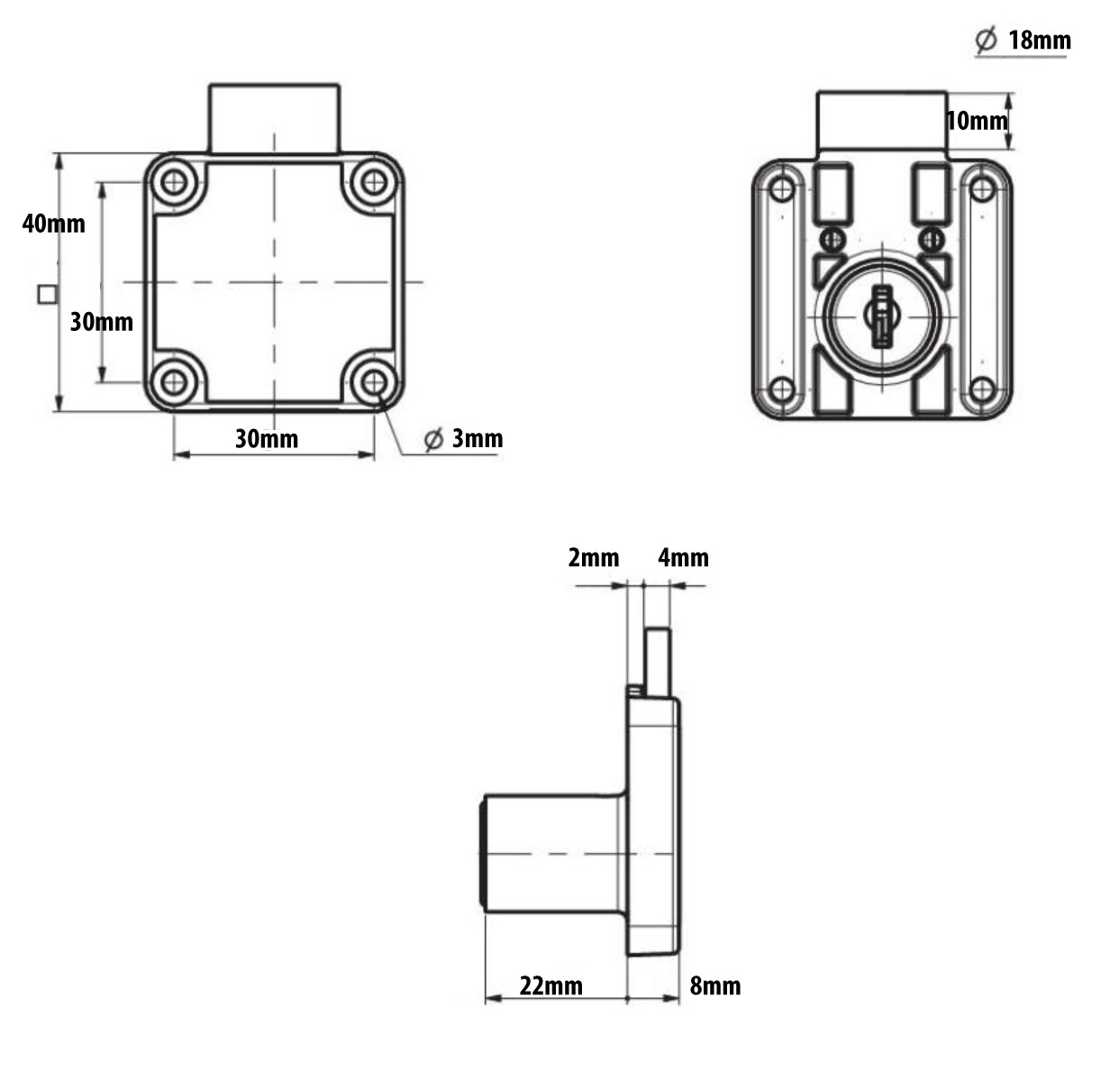 Dimensions: 40mm * 40mm. Nozzle; Diameter 18mm, Length 22mm.,Keyed Alike available on request.